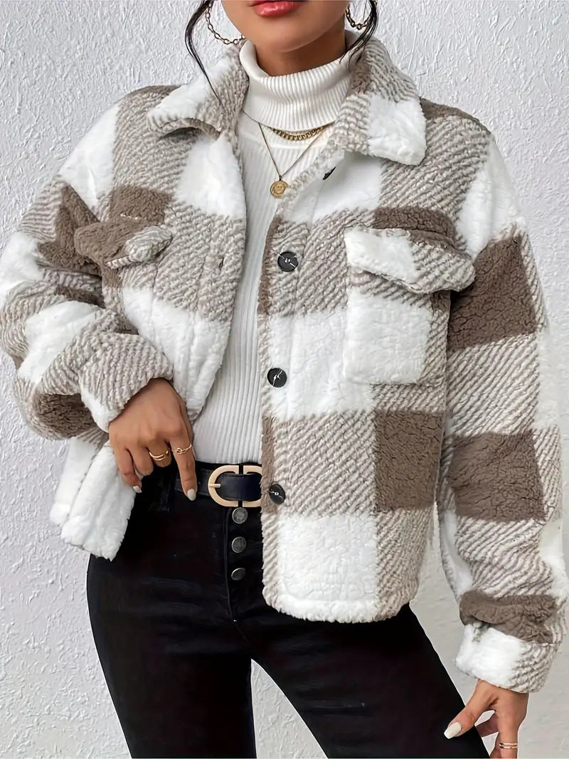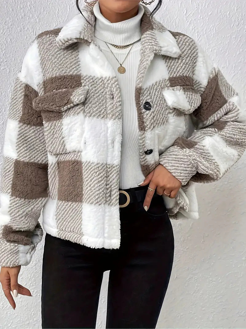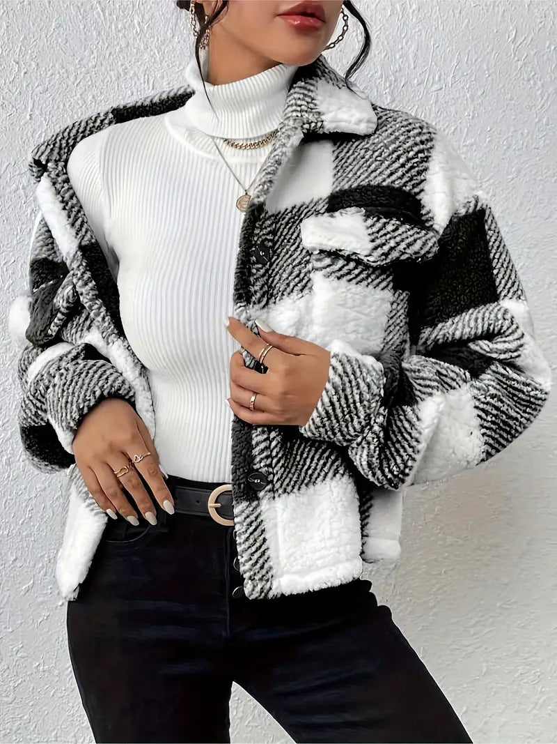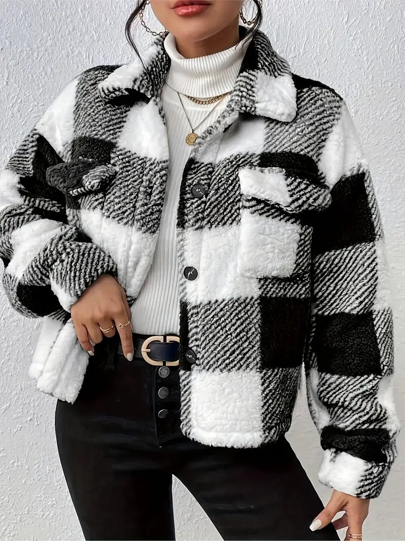 • Teddy Bear Plaid Fusion: Una sofisticata unione tra la morbidezza del tessuto effetto pelliccia e il rigore del disegno a quadri, ideale per chi cerca un look "Elegant Commuting" che non passa inosservato.