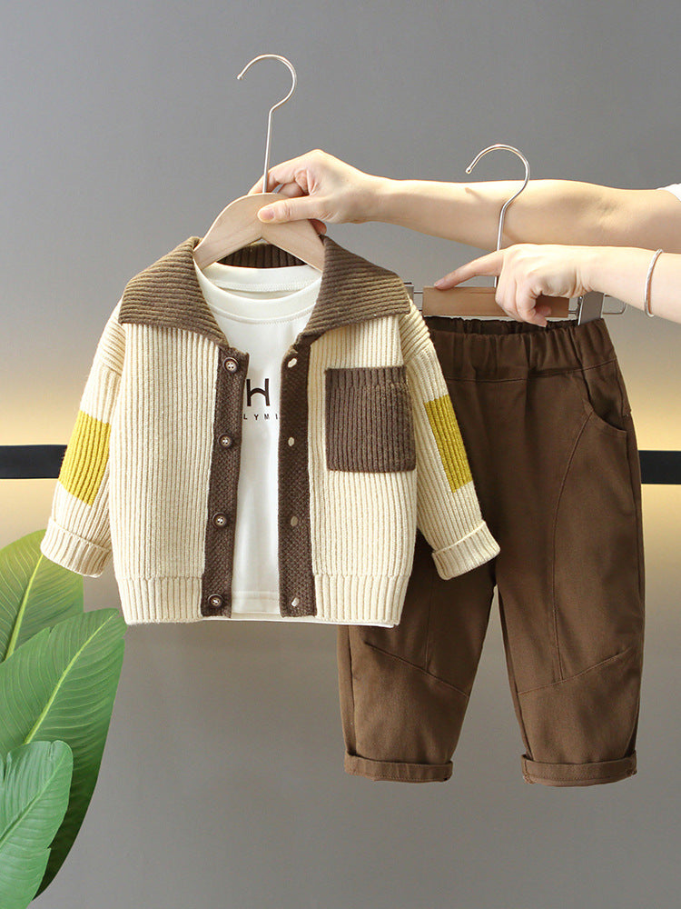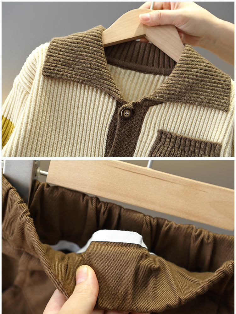 Silhouette "Cardigan Three-Piece" & Comfort Fit: Il set si compone di tre pezzi coordinati (cardigan, top interno e pantaloni), studiati dai designer di astamaestro per offrire la massima modularità. La chiusura Single breasted e il design senza cappuccio permettono una vestibilità pulita, facilitando i movimenti del bambino e semplificando le operazioni di cambio per i genitori.