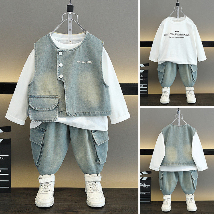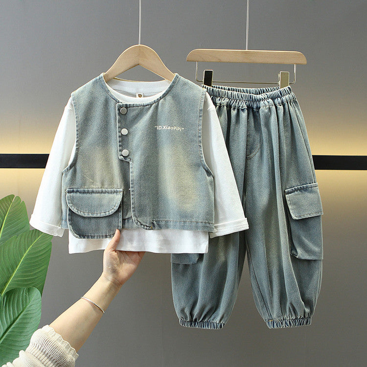 Silhouette "Structured Three-Piece" & Design Senza Cappuccio: Il set si compone di tre pezzi coordinati (giacca monopetto, top interno e pantaloni), studiati dai designer di astamaestro per offrire un look stratificato e professionale. La chiusura Single-breasted e il taglio dei pantaloni a tutta lunghezza (Trousers) conferiscono al bambino un aspetto ordinato, elevando il denim a un livello di raffinatezza urbana superiore.