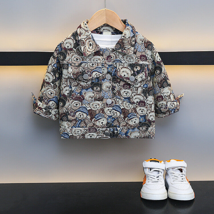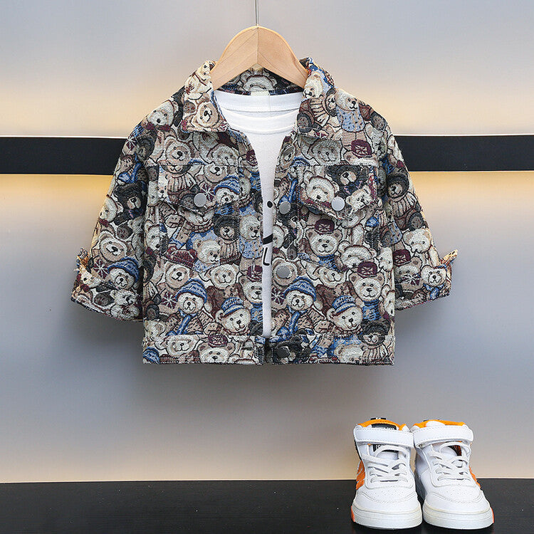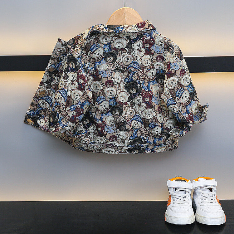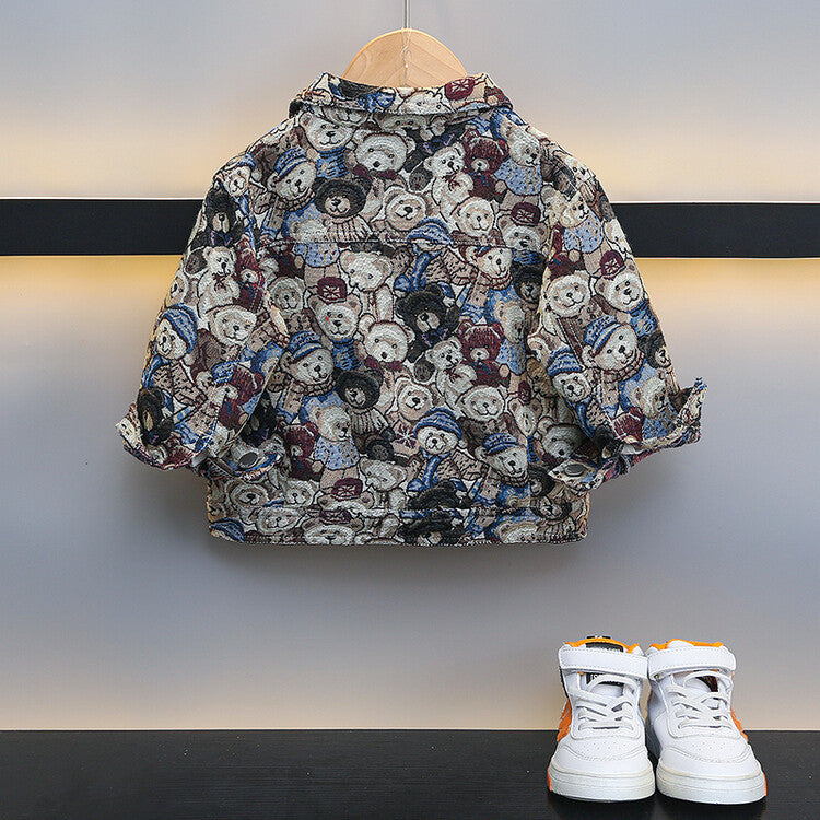 Pattern "Cartoon Jacquard" & Estetica Distintiva: Il pattern orsetto non è semplicemente stampato, ma tessuto direttamente nella struttura della giacca (Jacquard). Questo conferisce al capo una durabilità superiore e una percezione di lusso che posiziona il brand come leader nella ricerca estetica per il mercato junior del 2026.