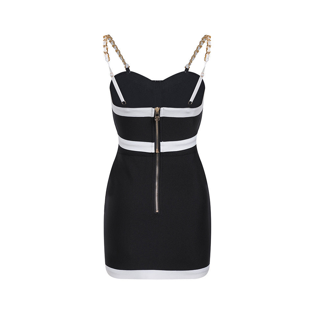 Dettagli: Motivo geometrico a contrasto, dettaglio fiocco, effetto bendaggio modellante.
