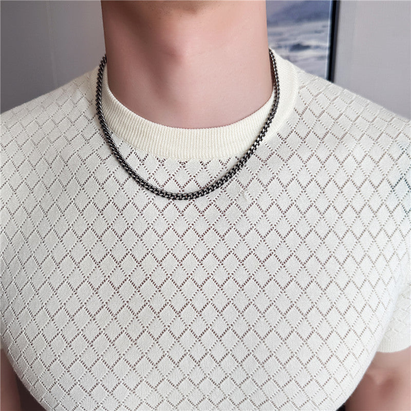 • Geometric Lattice Aesthetic: Caratterizzata da un raffinato motivo a reticolo (Lattice), questa maglia eleva il concetto di t-shirt verso una dimensione "Knitwear" sofisticata, perfetta per distinguersi nei contesti "Youthful Trends" del 2026.