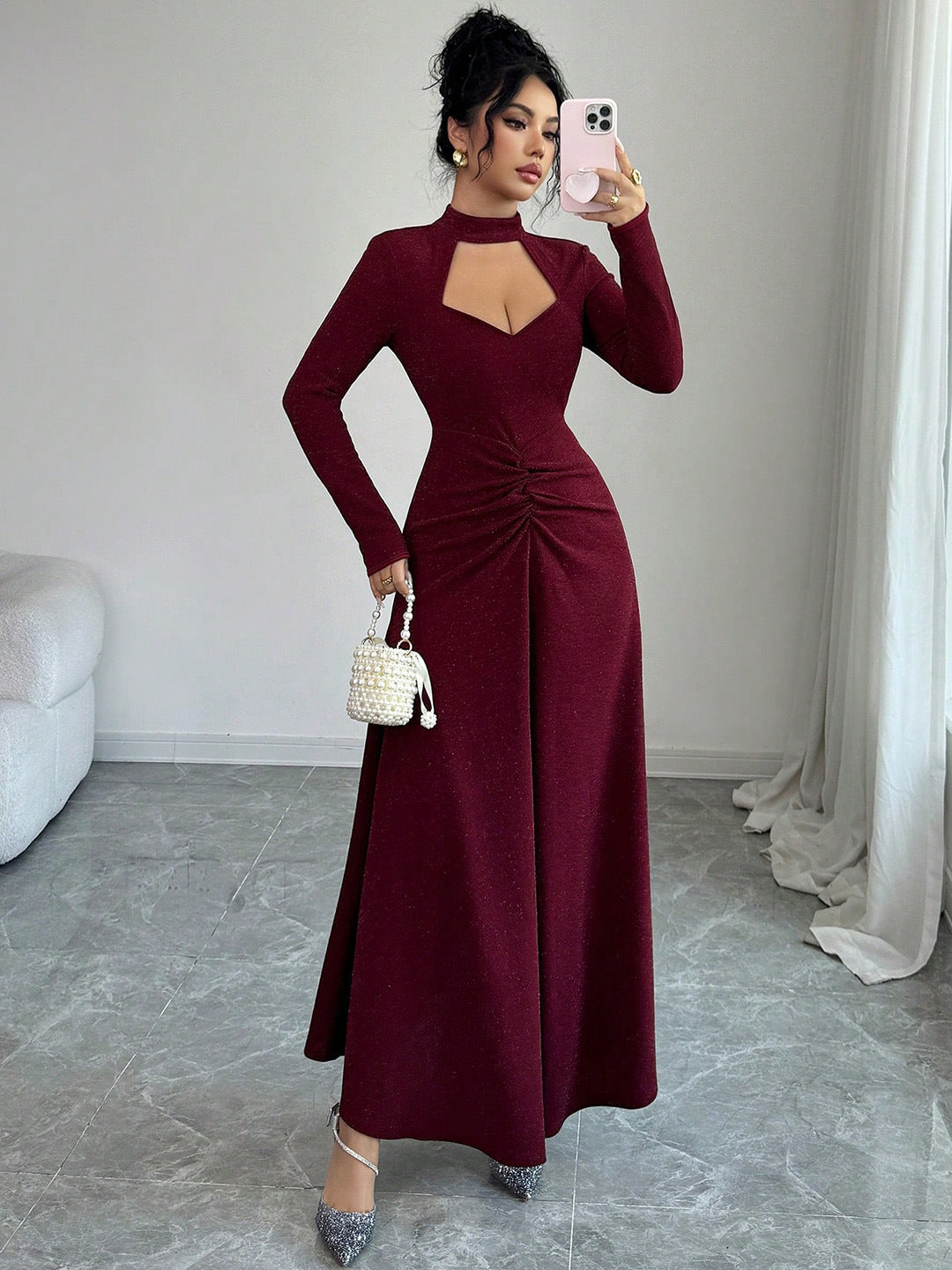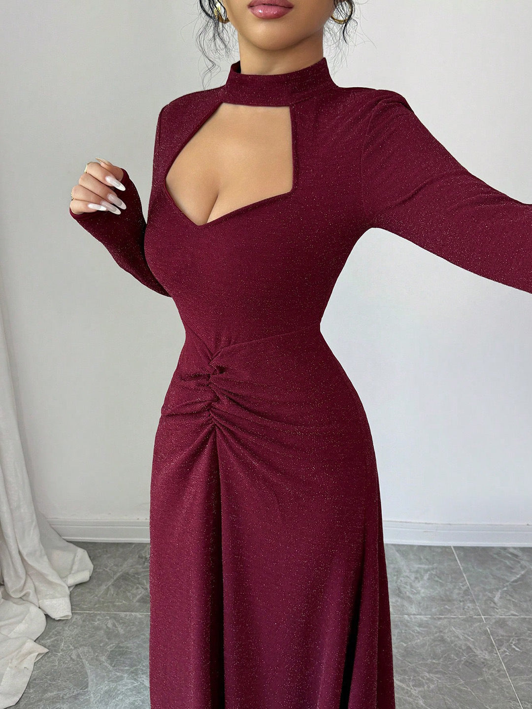 • Pleated Hip-Skirt Detail: La gonna a tubino (Hip skirt) è arricchita da pieghe strategiche (folds) che aggiungono profondità tridimensionale al colore solido, rendendo l'abito magnetico e visivamente dinamico.