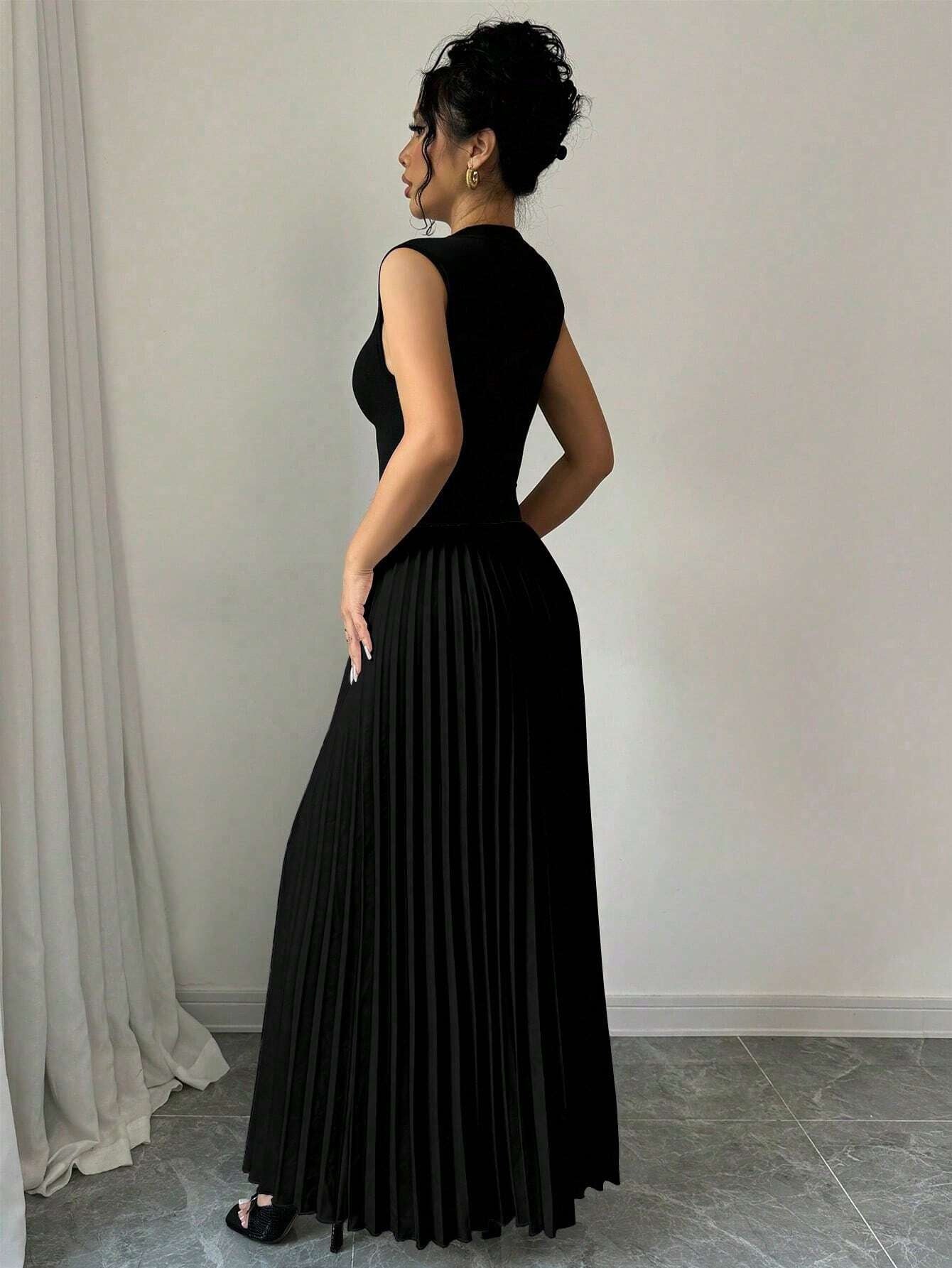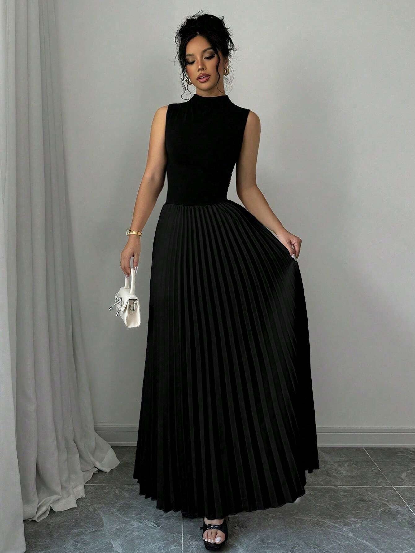 Abito Lungo a Colonna con Collo Alto e Texture Plissettata